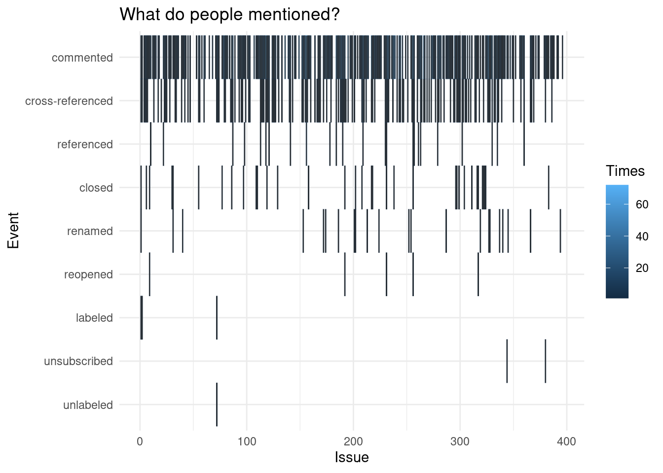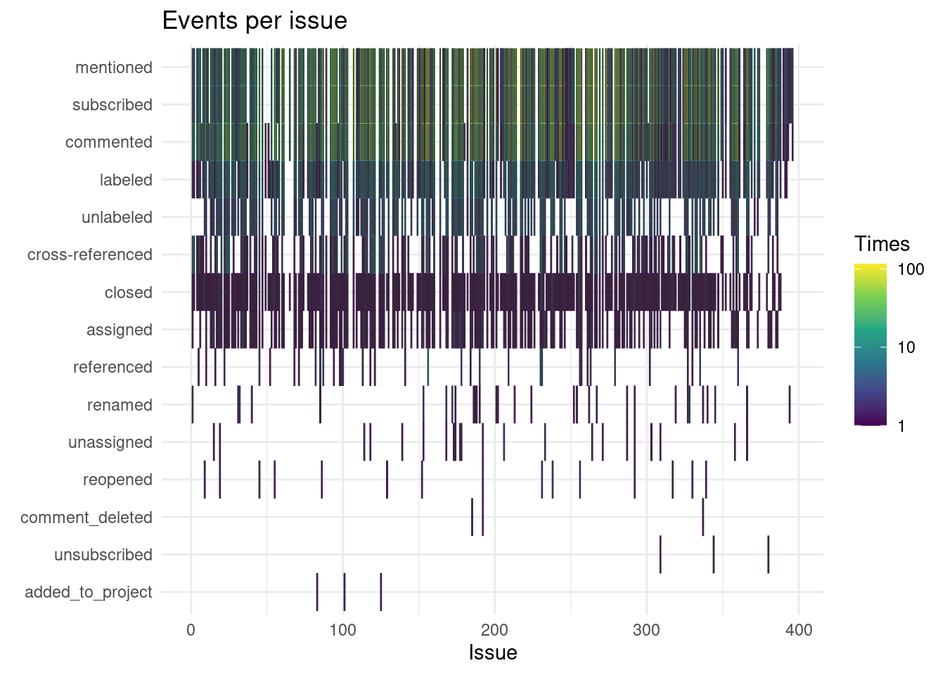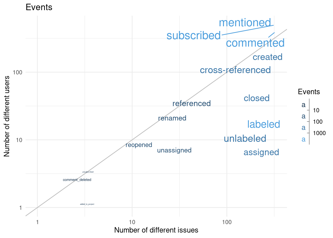 It is fairly similar to Bioconductor. We can see that issues have fewer events than on Bioconductor. This is because there isn’t any bot replying with each update to the repository neither a report of the build with every version increment.