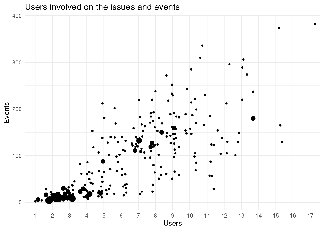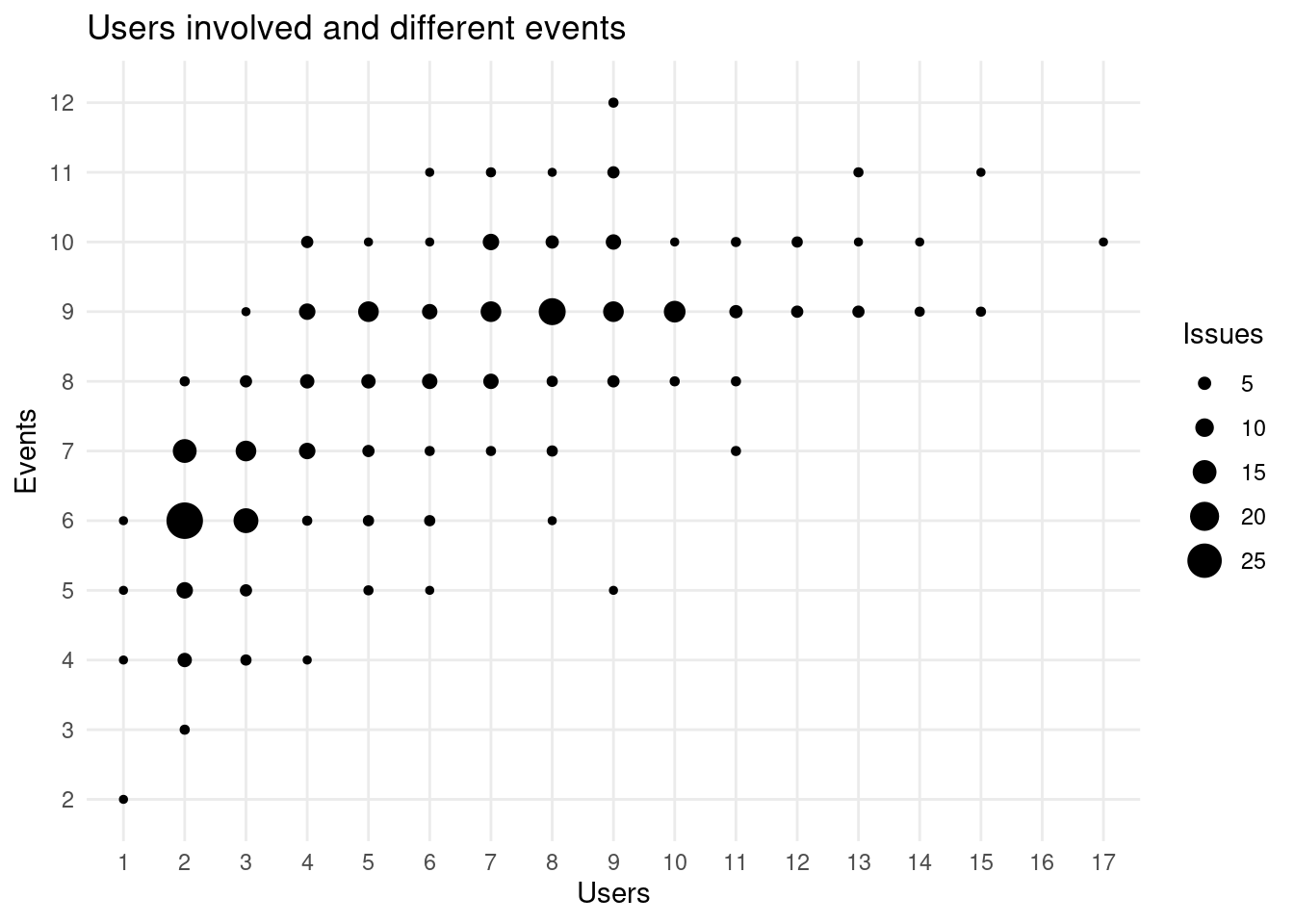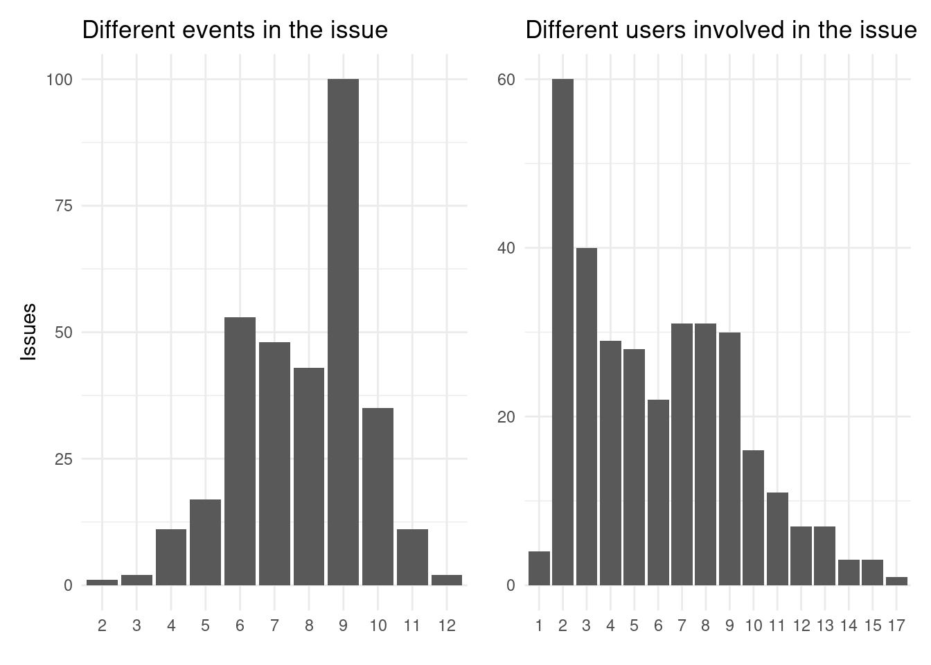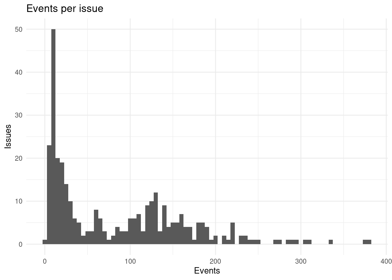 It is fairly similar to Bioconductor. We can see that issues have fewer events than on Bioconductor. This is because there isn’t any bot replying with each update to the repository neither a report of the build with every version increment.
