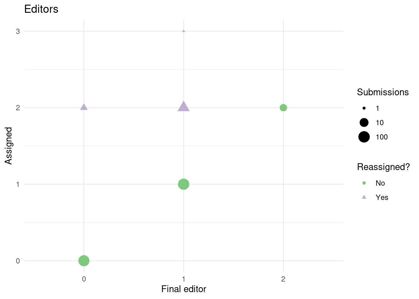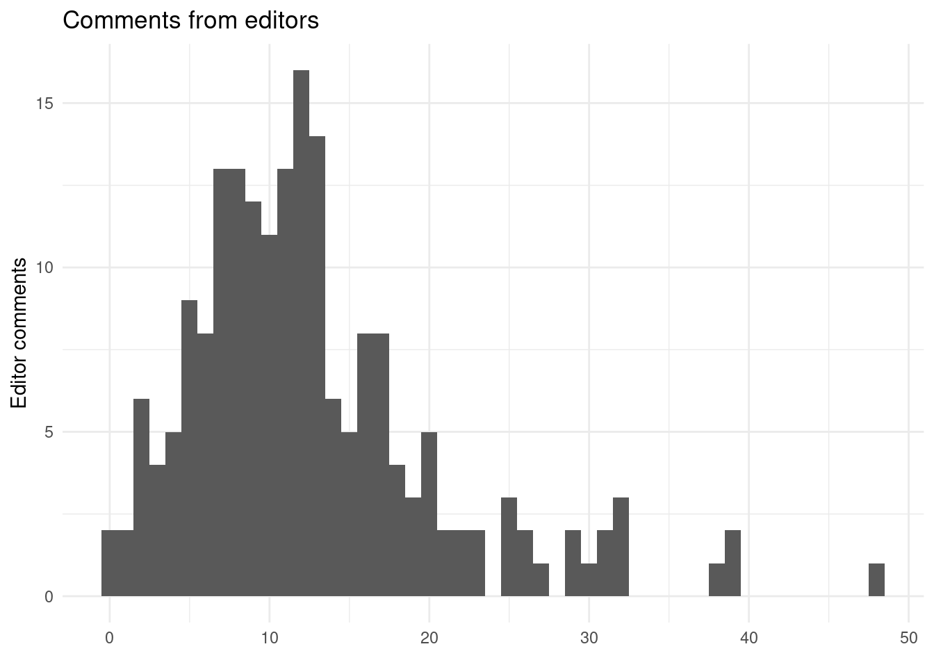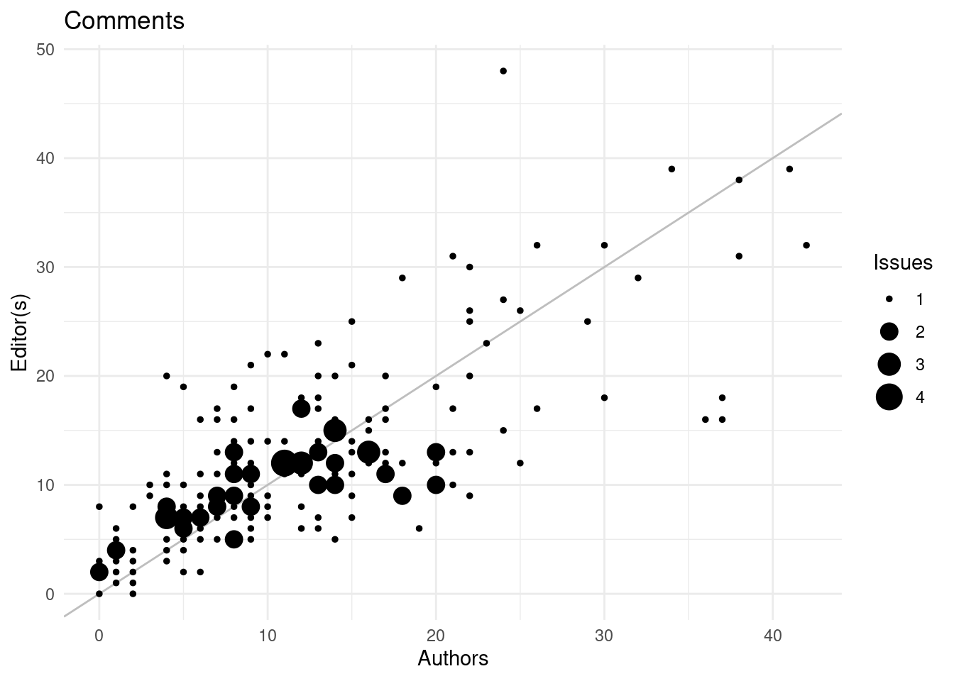 If we look at how many comments there are on each issue per author and editor we can get a sense of how much work it takes for editors: