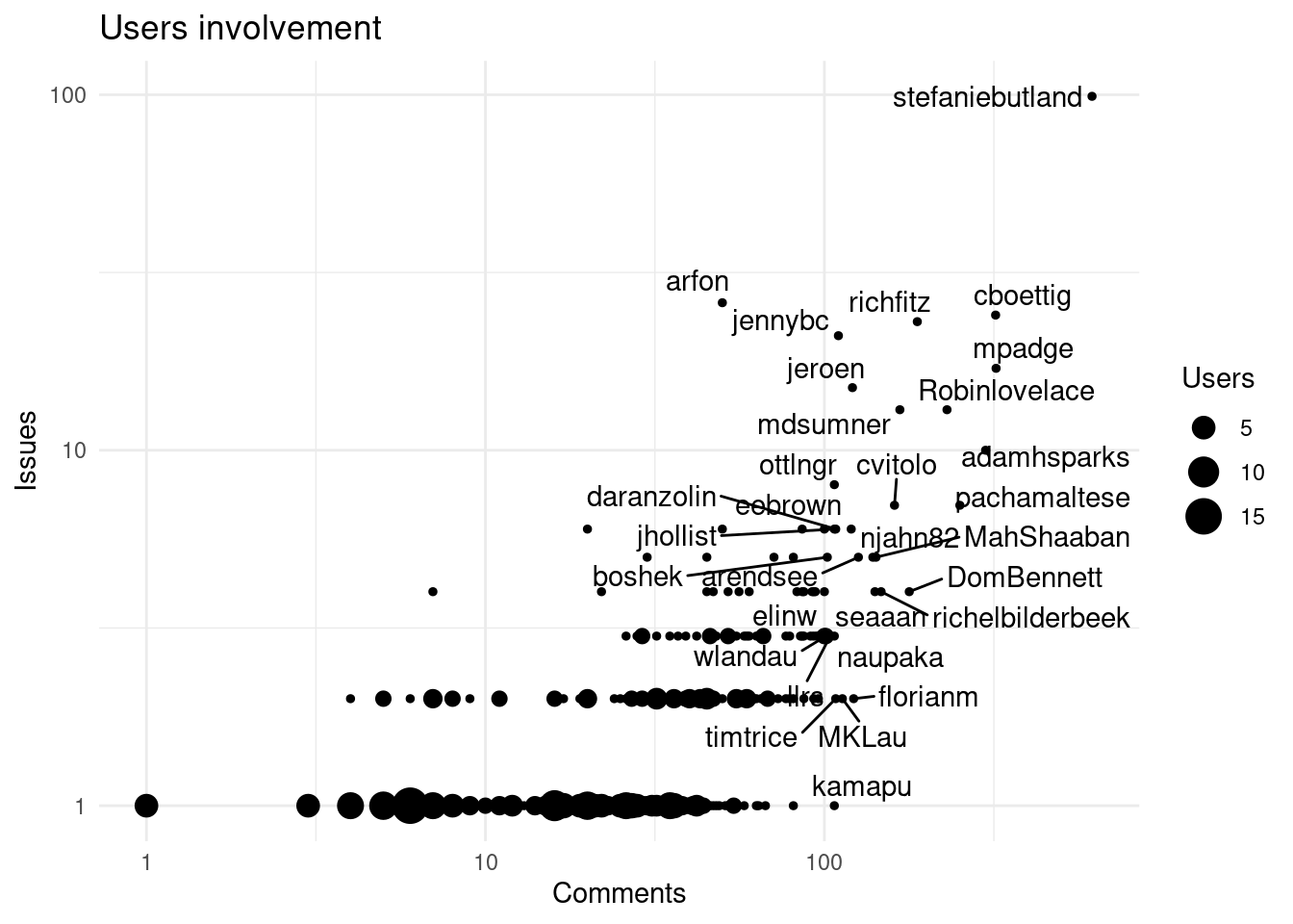 Here I kept the same threshold to show the names of users. There are more names, indicating more people commenting and involved on the issues. I’m surprised to appear on this graph because I haven’t been much involved with rOpenSci. Stefanie Butland as the community manager of rOpenSci comments more and is involved in more issues than regular users.