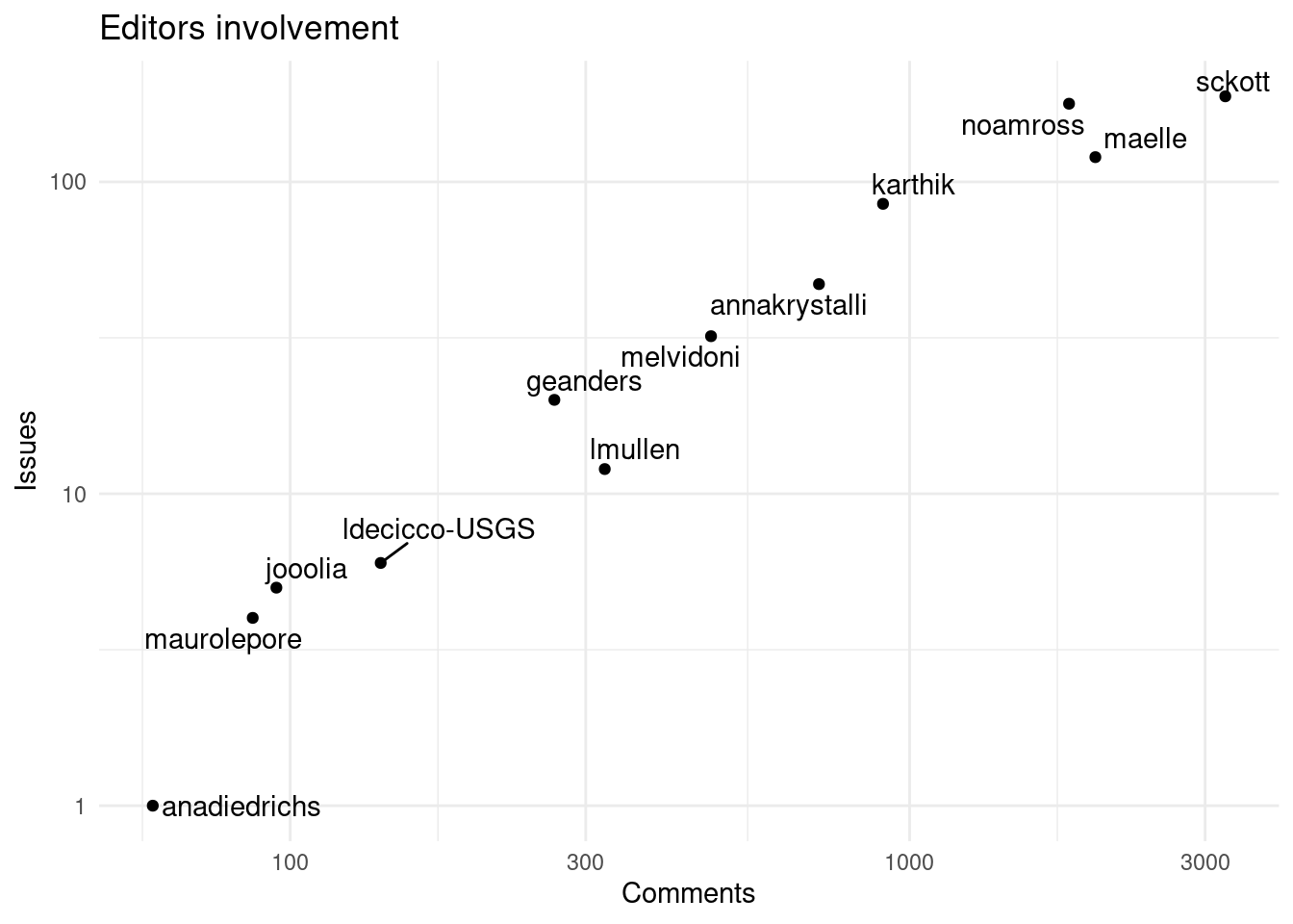 Following last post on Bioconductor I wanted to analyze another venue where code reviews are made: rOpenSci. There are some other analysis of the the reviews made by rOpenSci themselves: