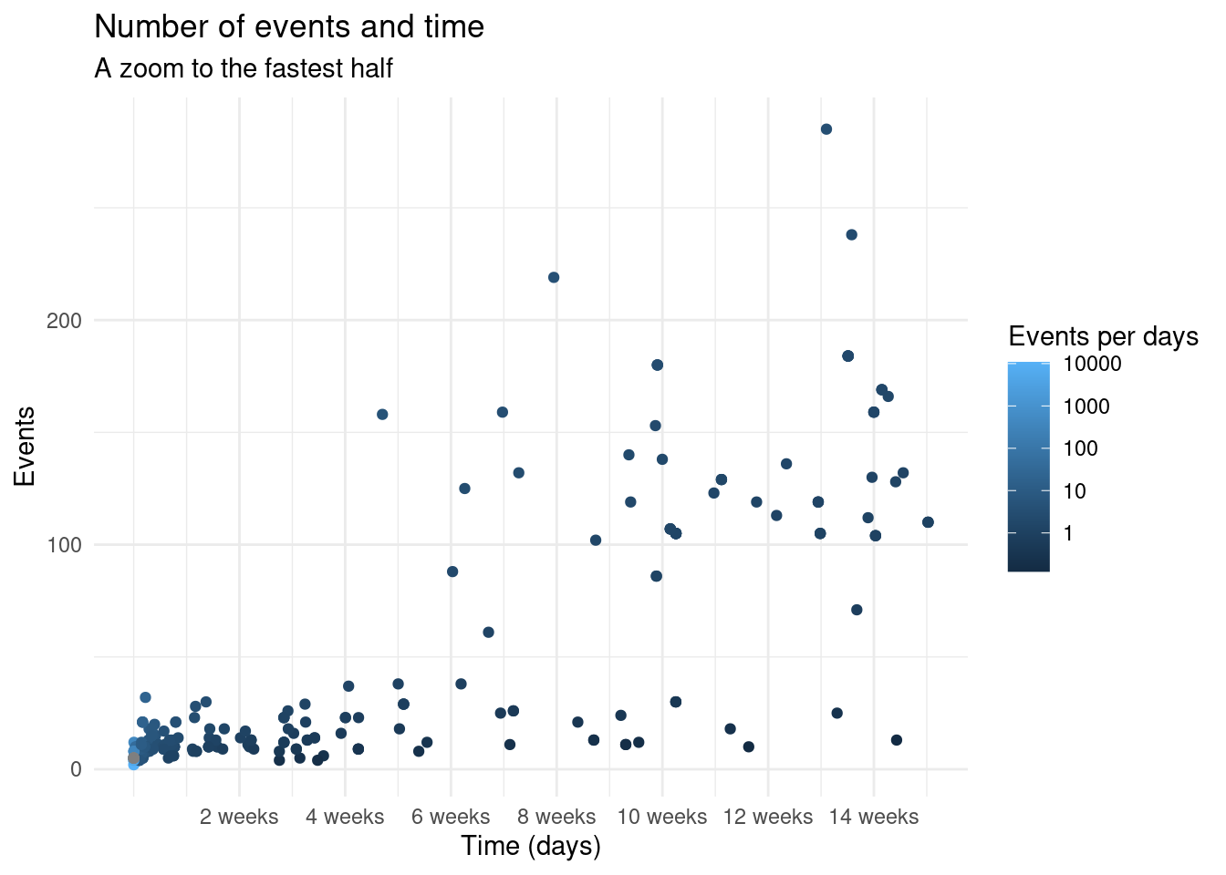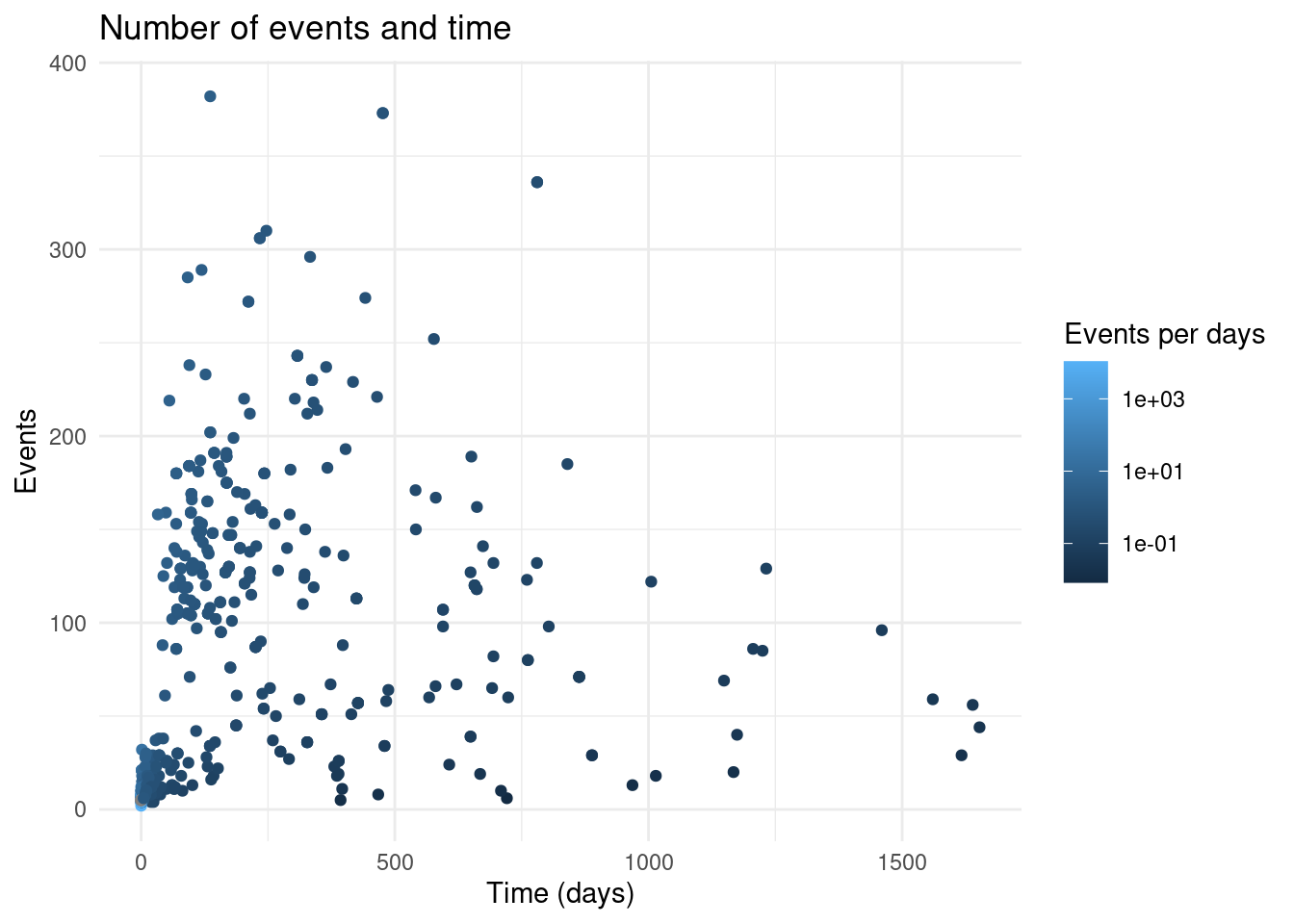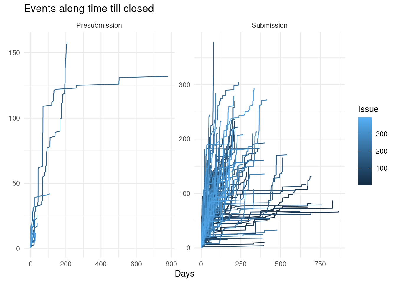 We can see that one presubmission issue took longer to decide than most of the submissions! In general submissions show the same behavior as in Bioconductor: Most of them have lots of events on a relatively short period of time. Some submissions take longer to close and remain without events for long periods of time.