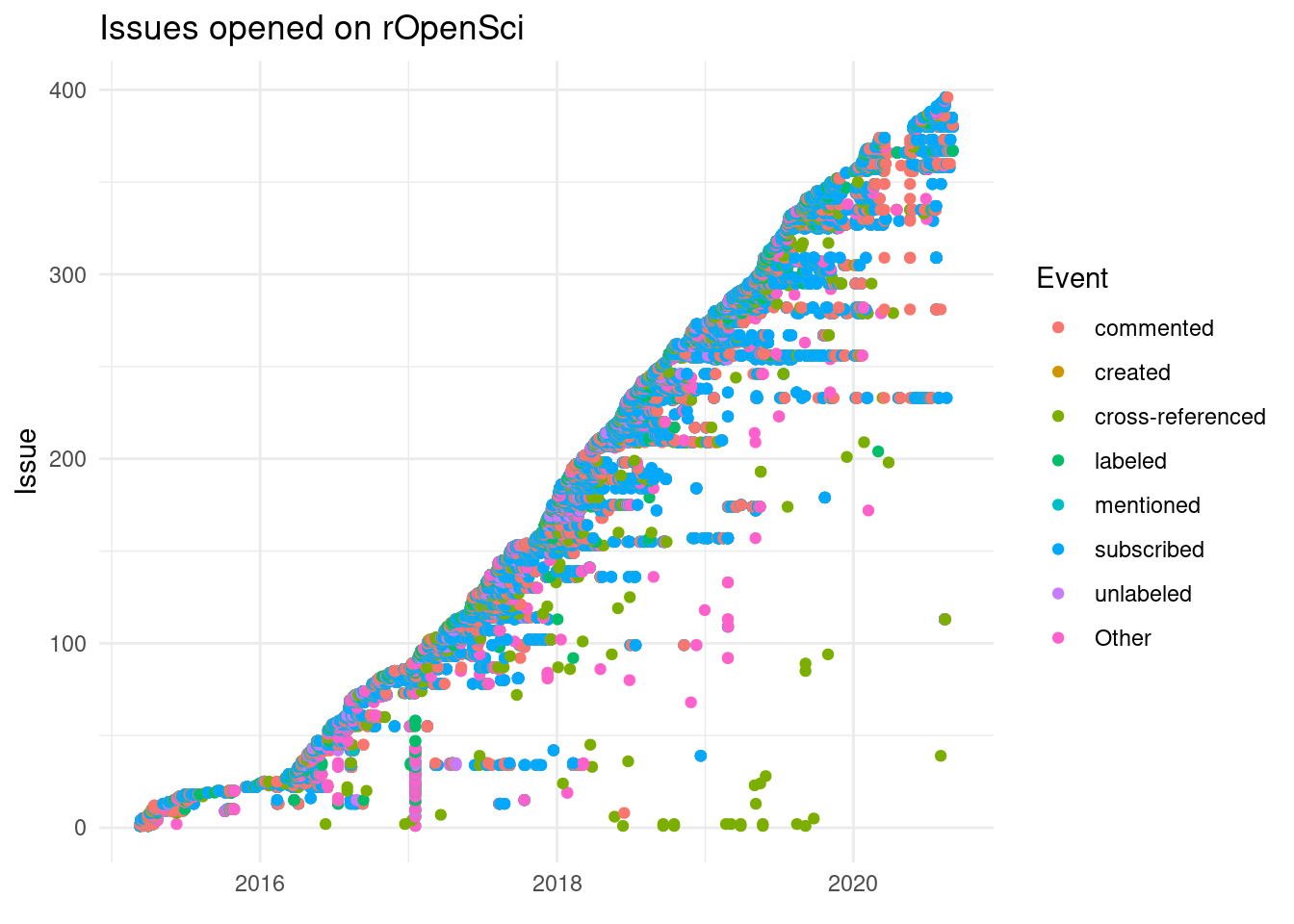 We can see that there are fewer issues opened on rOpenSci but also the timeline is shorter. One difference is that there seems to be more events after the initial activity on the issues.