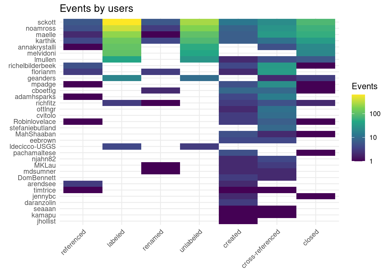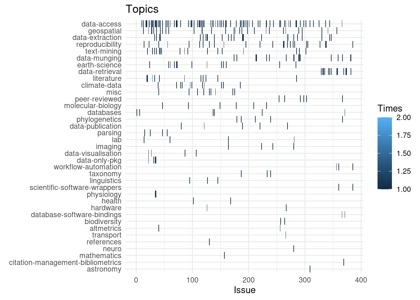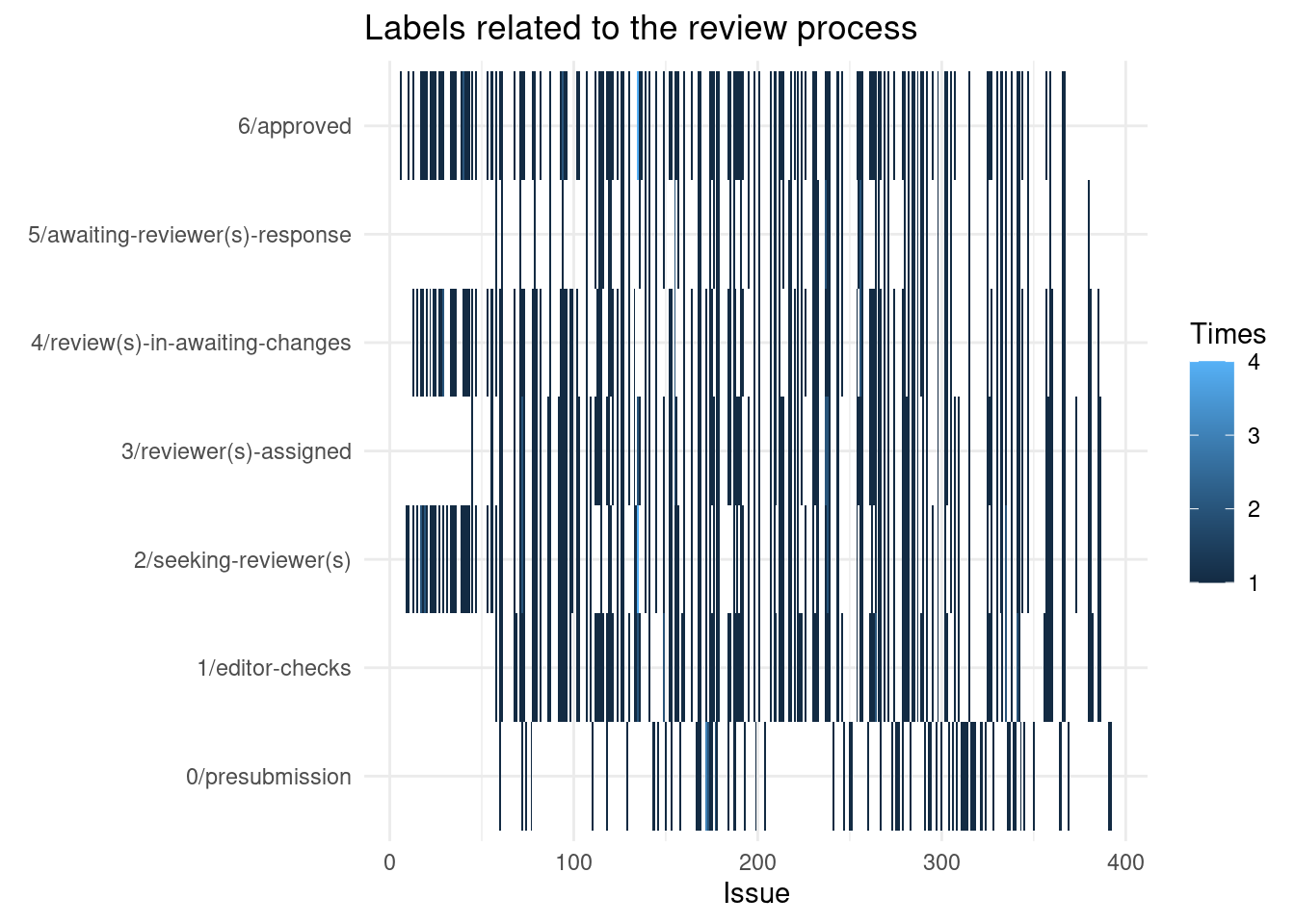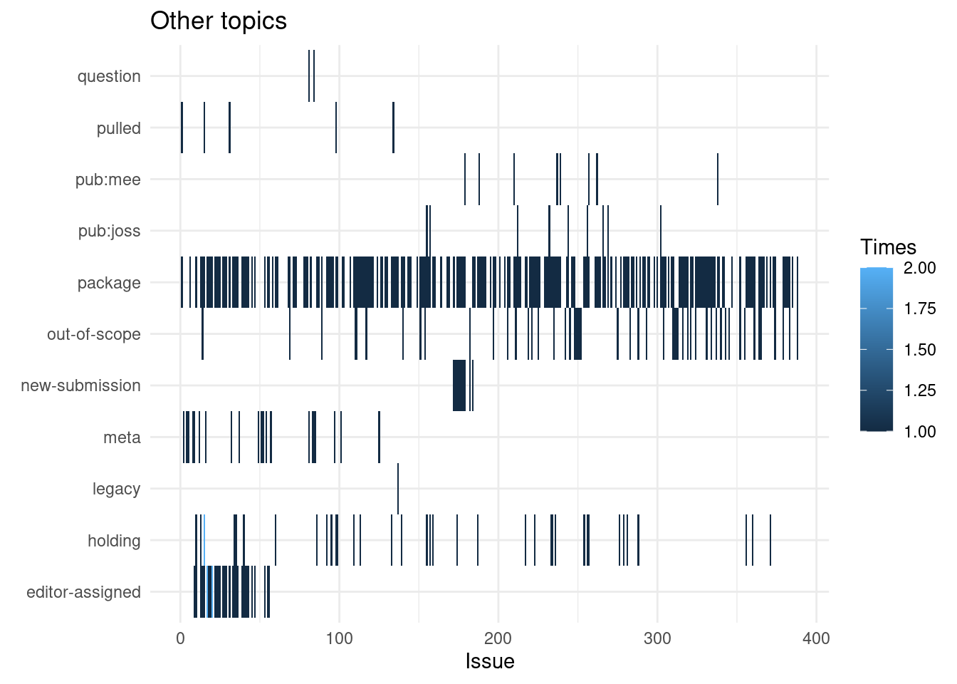 Other labels assigned, seem to be for packages or some other related to the process. Surprisingly there have been few submissions to MEE and JOSS according to the “pub:” labels.